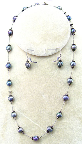 BLUE-BLACK PEARL NECKLACE WITH MATCHING EARRINGS: Irregular shaped pearls strung on twine with silver dividers. Toggle clasp, 18'' long. Sole with matching earrings, stamped sterling.