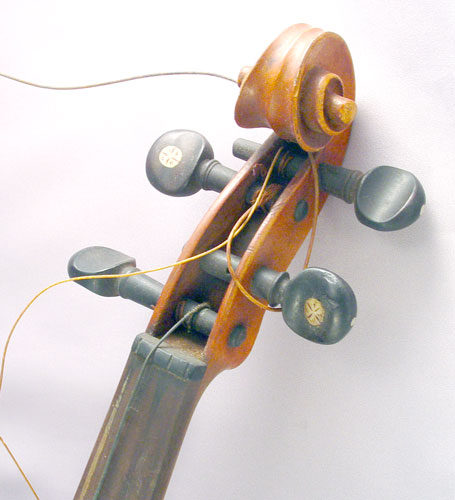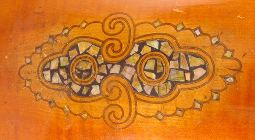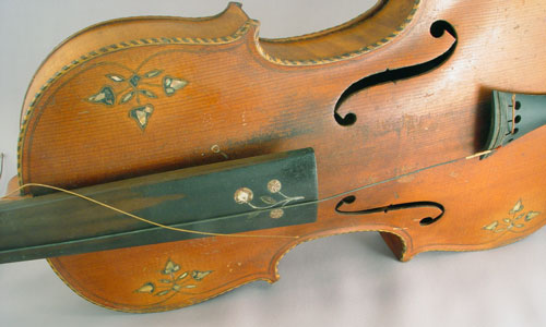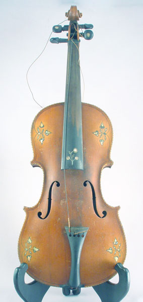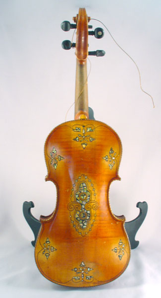 MOP INLAID BOHEMIAN / GYPSY VIOLIN: Mother of pearl and scroll inlaid decoration on Tiger maple back, body. Inlaid flowers on bottom fingerboard, pegs. Stringing veneer on purfling. No bridge, tailpiece is loose. Loose piece inside body. No makers name or identifying marks. Please note some wear to varnish.