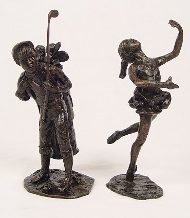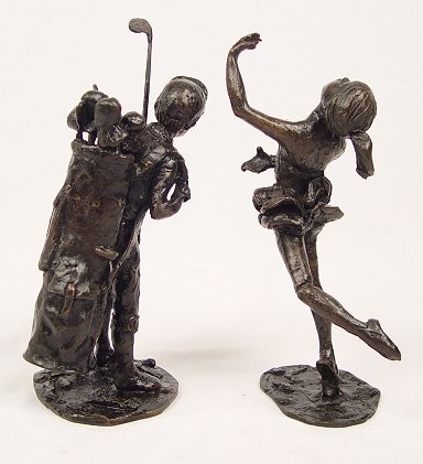 2 BRONZE SCULPTURES, ONE SIGNED JILL SANDERS, BALLERINA AND BOY GOLFER: Signed ballerina measures8 1/2'' h., Unsigned young boy golfer measures 9'' h.