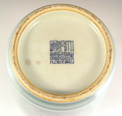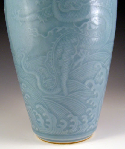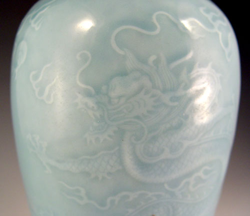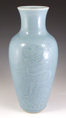 CHINESE VASE: Powder blue, dragon design under glaze. 13'' high. 20th century.