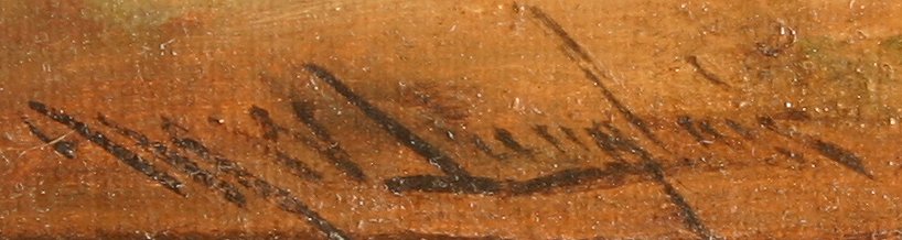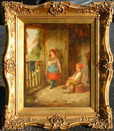LANGLOIS, Mark William, (British, 1850-1890): Young Boy and Girl with Goose, Oil/C, 21'' x 17'', signed, gilded and carved frame, 31'' x 27''.
