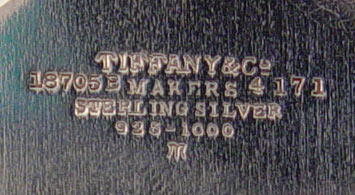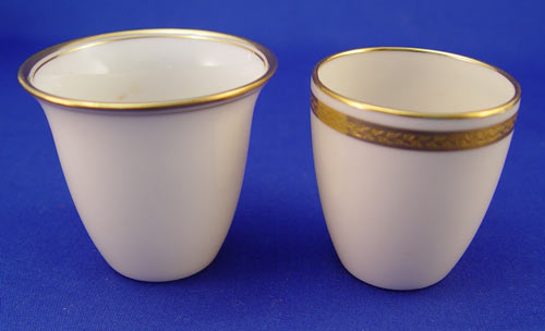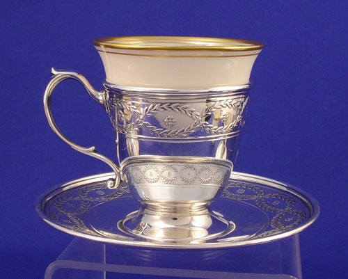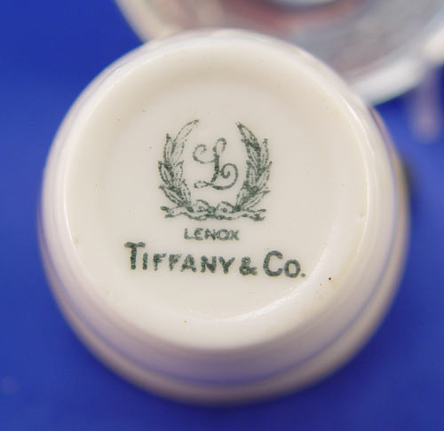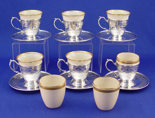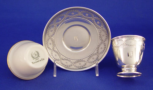 TIFFANY & CO STERLING DEMITASSE CUP HOLDERS WITH LENOX INSERTS: 6 holders with embossed crossed wreath design. Marked ''Tiffany & Co. 18705 B Makers 4171 B Sterling 925-1000''. Cups measure 2 1/4'' high. 6 matching saucers measure 4 1/8'' dia. Both saucers and holders monogrammed. 8 Lenox for Tiffany & Co. inserts; 5 of one design and shape, 3 of another. Gold leaf rims. Measure 2 1/4'' high and 2 1/8'' high. Approx. 22.2 troy oz.