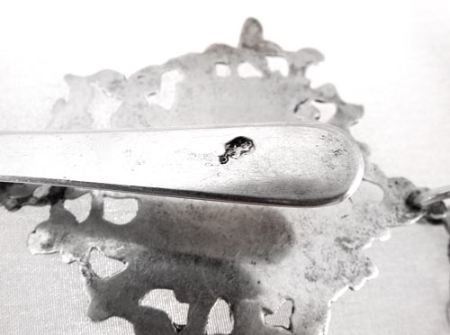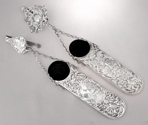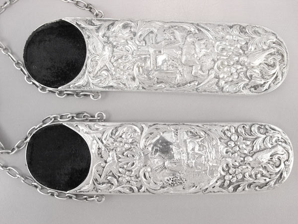 2 VICTORIAN CHATELAINE EYEGLASS CASES: Hang from chain off belt to hold eyeglass. Embossed Dutch scenes with sheep, windmill, birds, floral design. Unknown Dutch hallmarks. Measure 6 1/4'' high, 11 1/2'' long overall.