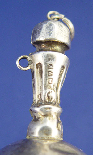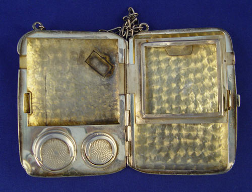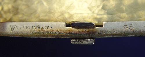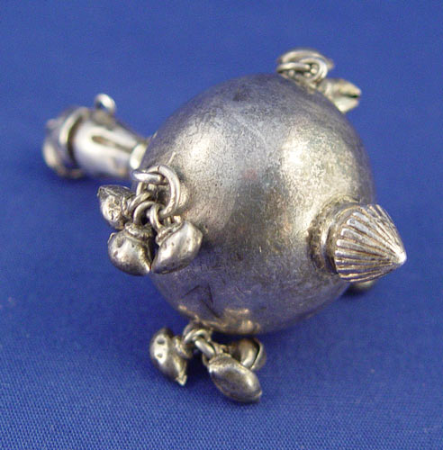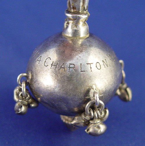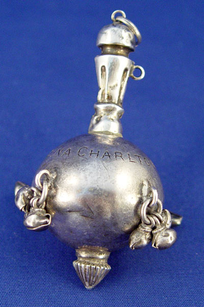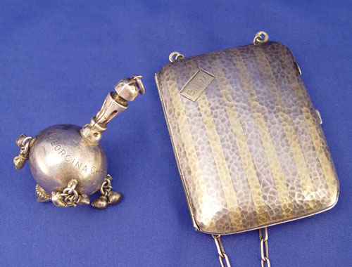 CLARENCE VANDERBILT STERLING AND 18K MONEY CASE & ENGLISH STERLING RATTLE: Early 20th century sterling with 18K gold striped accents money clip and case by Clarence Vanderbilt. Case has interior spring holders for coins, clip for cash is missing. Carrying chain attached. Monogrammed G.L.W.. Measures 3 5/8'' x 2 3/4''. Approx 3.8 oz. Also included Chester England 1918 sterling hallmarks. Rattle has rings for hanging from chain as pendant. Inscribed Georgina Charlton Woods. Measures 3'' high. Approx. 1 troy oz