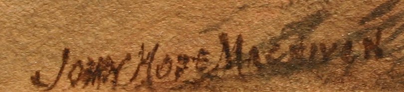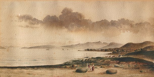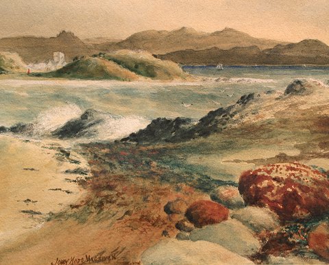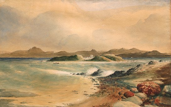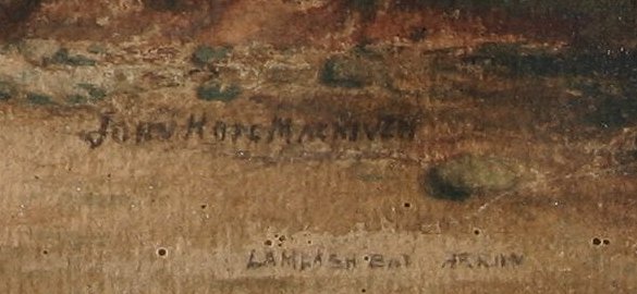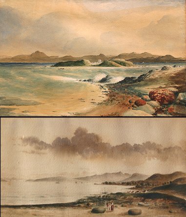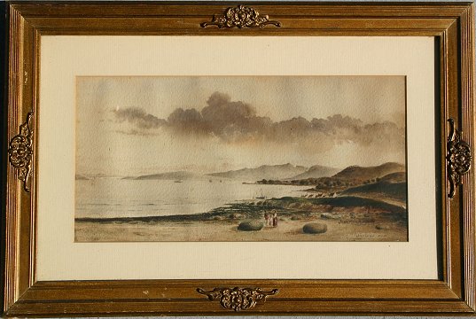 MACNIVEN, John Hope, (Scottish, 19/20th C.): 2 Watercolors, ''Lamlash Bay, Arran'', 6 1/2'' x 13'', signed and titled, framed. Insect damage in upper left quadrant, minor scattered foxing. ''Firth of Forth'', 9'' x 14'', signed, framed, includes period hand written key to include: Island of Inch Colm, The Monastery, The Lammermoor range of hills, Arthur's Seat, Salisbury Crag's, Calton Hill, Edinburgh Castle and Rock, Pentland Range of Hills, Corstophine Hills, Contour of Canongate and High Streets, Old Town of Edinburgh. Overall browning of paper.