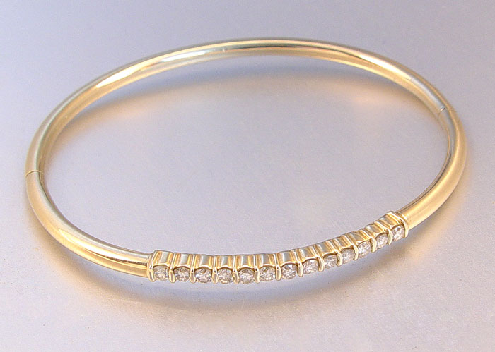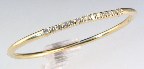 GOLD AND .75 CTW DIAMOND BANGLE BRACELET: 14K yellow gold bangle with thirteen round brilliant cut diamonds, Total weight approx. .75 Ct. Rated VS-SI in clarity and I-J in color. The diamonds are prong set. Weight: 6.5 grams. Approx. 2.5'' in diameter.