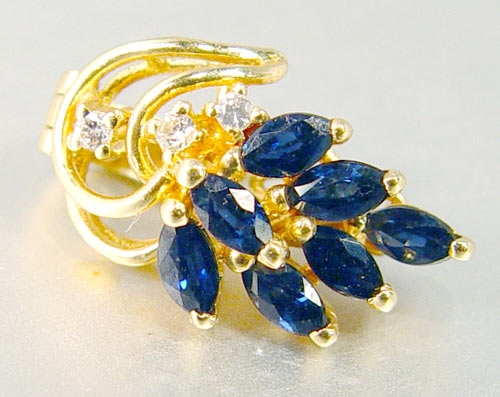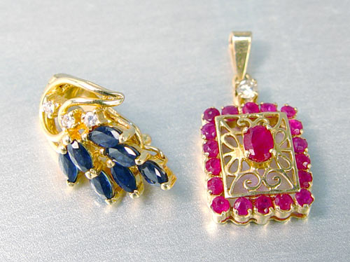 2 PC LOT OF 14K DIAMOND, SAPPHIRE AND RUBY PENDANT & ENHANCER: 1) 14K yellow gold ruby pendant with one .025 Ct. round brilliant cut diamond and nineteen round and oval shaped faceted rubies. Weight: Approx. .75 CTW. 2) 14K yellow gold enhancer with Three round brilliant cut diamonds, .03 Ct. total weight and seven marquise shaped faceted sapphires. Weight: .75 CTW Approx. Weight: 4.1 grams.