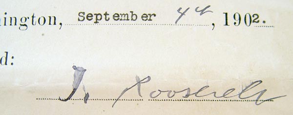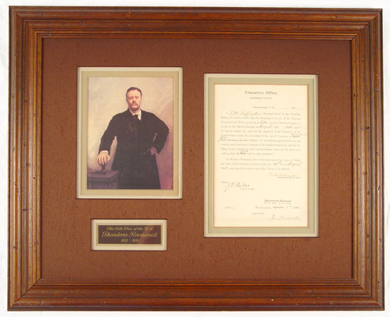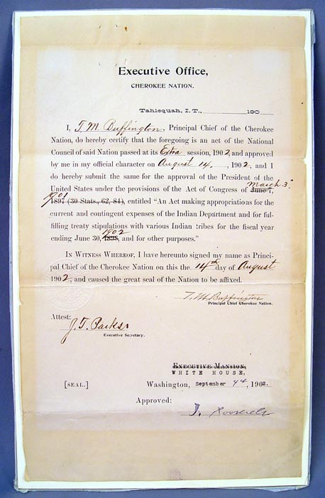 1902 THEODORE ''TEDDY'' ROOSEVELT SIGNED CHEROKEE INDIAN TERRITORY DOCUMENT: Important Cherokee Nation approval of the 1901 Act of Congress hand signed by T.M. Buffington, Principal Chief of the Cherokee Nation with Cherokee Nation seal, J.T. Parkes, executive secretary and President Theodore Roosevelt. Document is from the Executive Office, Cherokee Nation, Tahlequah Indian Territory. Comes framed and matted with portrait of Teddy Roosevelt. Frame measures 24'' x 30''.