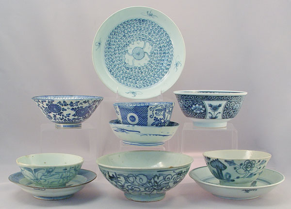 GROUP LOT OF 9 CHINESE CERAMIC BOWLS: Late 19th C - late 20th C, Ching to modern export. Blue decorated, 1 1/2''h. - 2 1/2''. 4 1/2'' dia. - 2 1/2''h.