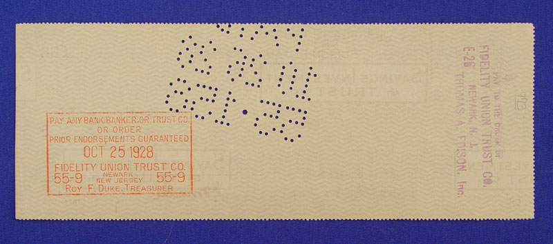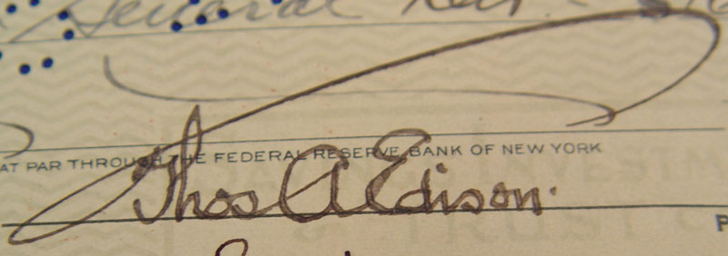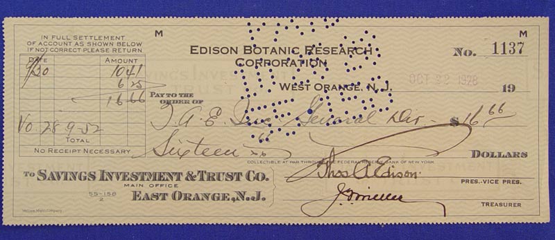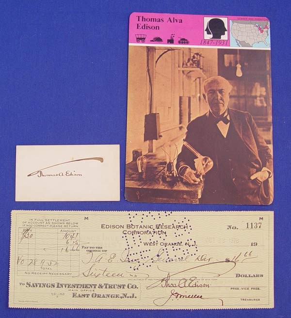 2 THOMAS A. EDISON AUTOGRAPH LOT: To include late 1880's clip autograph with full first name. Clip measures 1 3/4'' x 3 1/2''. 1928 dated Edison Botanic Research Corporation check. Both autographs are hand signed by Edison.