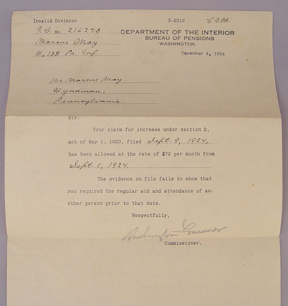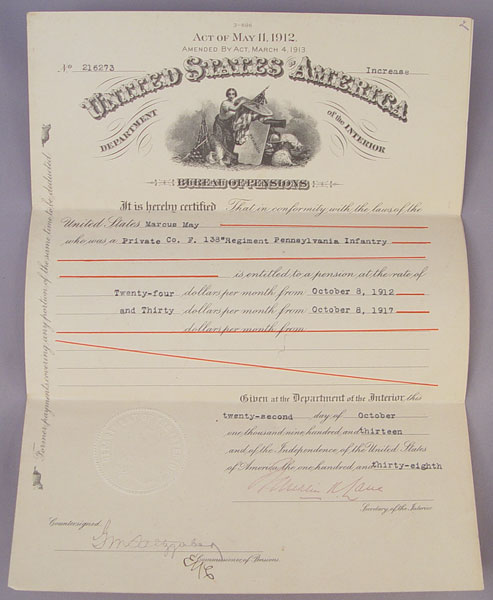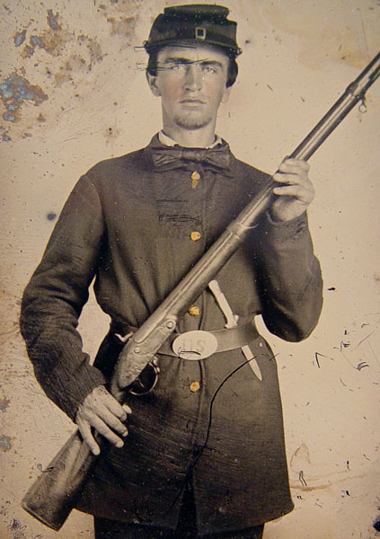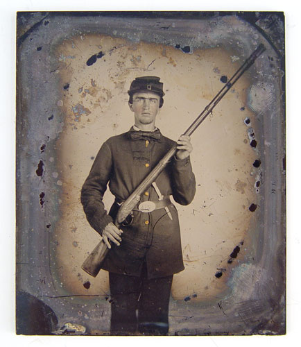 IDENTIFIED PENNSYLVANIA CIVIL WAR SOLDIER AMBROTYPE: Marcus May, 138th Pennsylvania tintype image holding rifle, with side knife in belt. Identified with pension document, directly from descendants. Please note some discoloration around edges of glass, image is nice and crisp with a few minor scratches. Case missing lid. Measures 3 1/8'' x 2 5/8''. Also comes with assorted land grants, deeds, releases from Schuylkill County Pennsylvania dated 1842-1876, no relationship to photo.