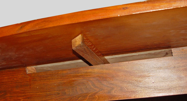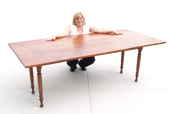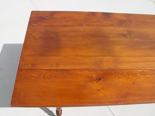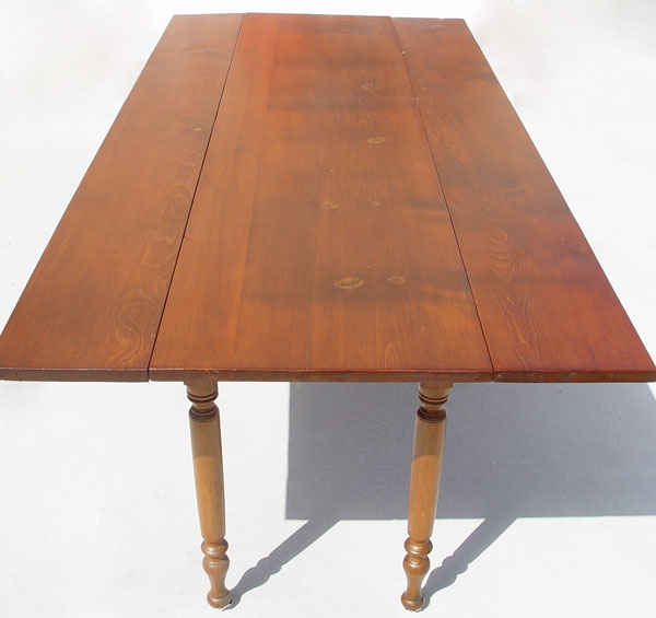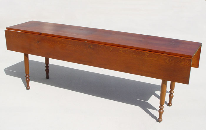 AMERICAN COUNTRY DROP LEAF PINE HARVEST TABLE: Long table with drop leaves and turned legs. 7' 2'' long, 30'' high. With leaves extended the table is 40'' wide, with leaves down, 22'' wide.