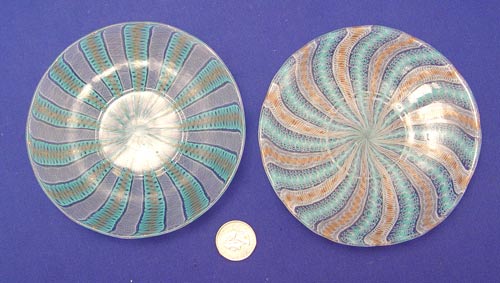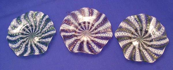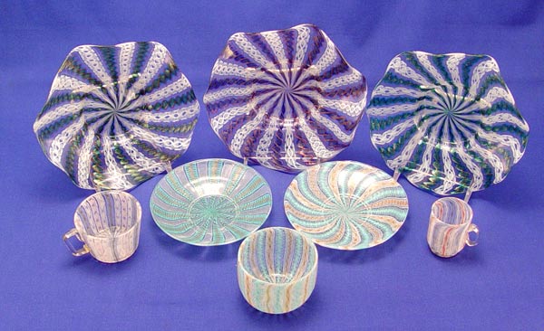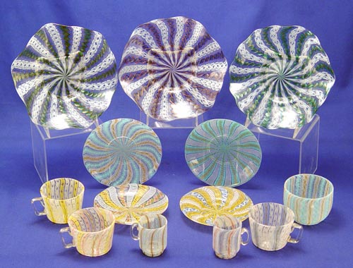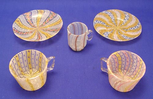 LATTICINO ITALIAN ART GLASS COLLECTION: 13 pieces to include 3 bowls (6 3/4'' dia.), 2 mini mugs (2''h), a handleless cup with two saucers, 2 cups and saucers and an extra saucer.