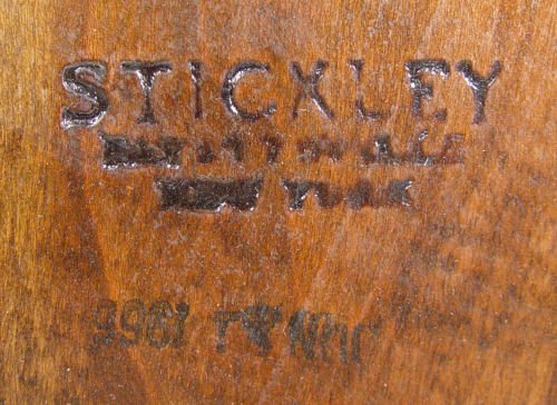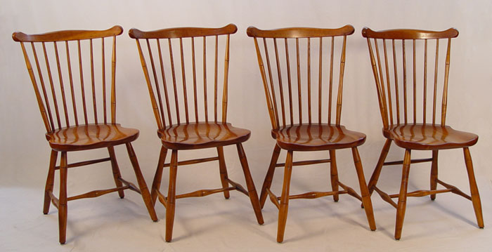 4 WINDSOR STYLE CHAIRS BY STICKLEY: Comb back style Windsor chairs. Branded Stickley New York. Dated June 1966. 37'' high x 22 1/4'' wide x 16 1/2'' deep.