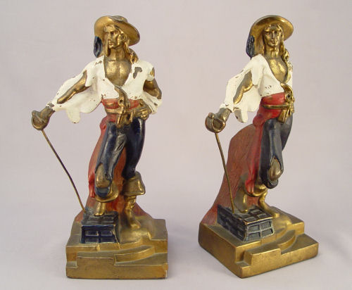 ARMOR BRONZE PIRATE FIGURAL BOOKENDS: Identical pair of swashbucklers with sword marked Armor Bronze. Measures 10 1/2'' high. Please note paint flake.
