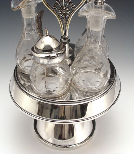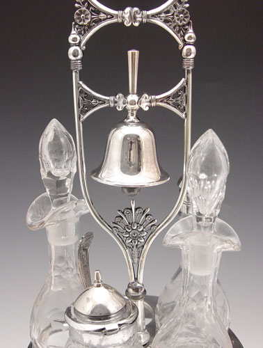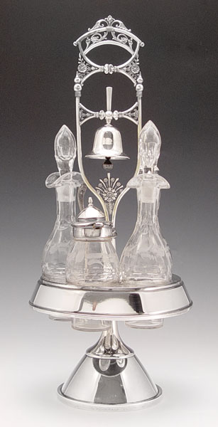 SIMPSON HALL & MILLER UNUSUAL SILVER PLATE CASTOR WITH BELL: Removable bell fits into handle, etched bottles. 17 1/2'' tall. Missing one bottle. Broken hinge on mustard bottle.