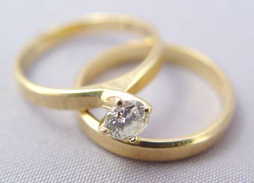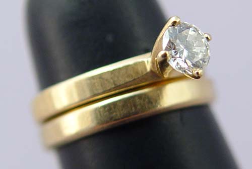 DIAMOND SOLITAIRE BRIDAL SET: 14K yellow gold bridal set. Featuring a round brilliant cut diamond, approx. .36 Ct., rated VS1 in clarity and H in color. The diamond is prong set. 3.00 mm matching wedding band. Size 6 Weight: 4.2 grams.