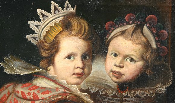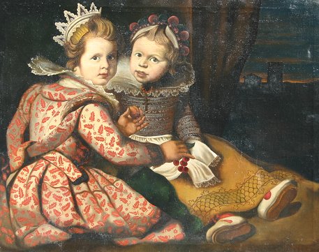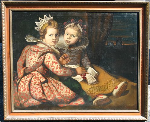 INTRIGUING O/C 2 YOUNG CHILDREN IN LANDSCAPE: Age unknown, 29 1/2'' x 37'', unsigned, 35'' x 42''. Scattered flecks, needs cleaning.
