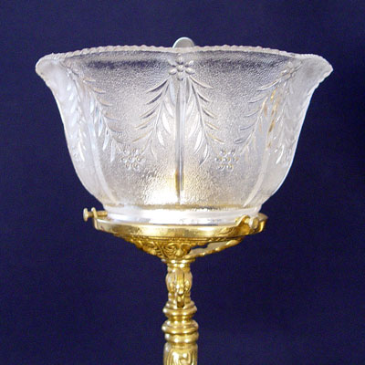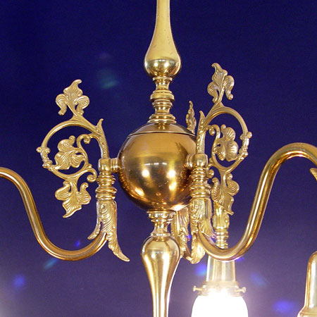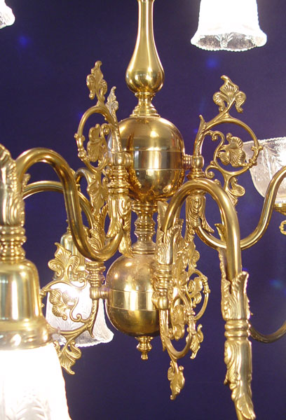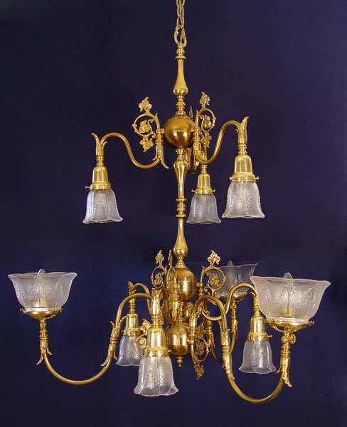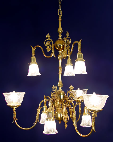 9 LIGHT BRASS CHANDELIER: 3 light over 6 lights, hangs 39'', 33'' wide. Removed from the hall of an old Maryland home, along with lots 56 and 57. Note two shades are cracked.