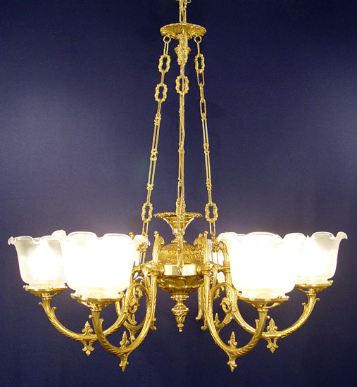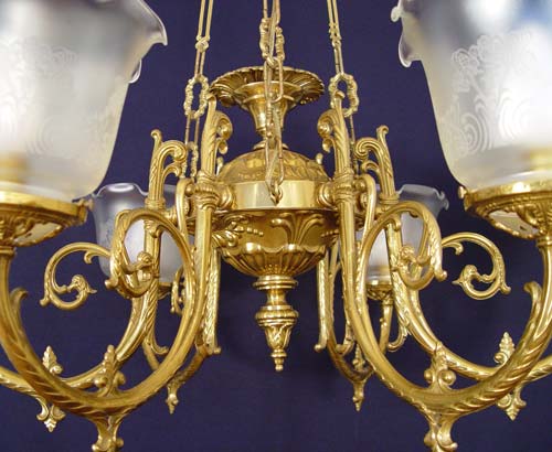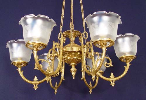 6 LIGHT BRASS CHANDELIER: Ornate scroll work, etched glass shades. Hangs from 3 chains. 44''h. x 36'' dia. Removed from the dining room of an old Maryland home, along with lots 55 and 57.