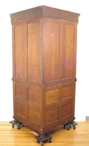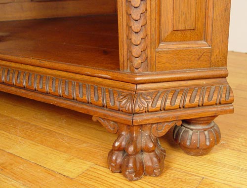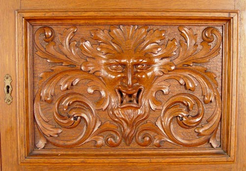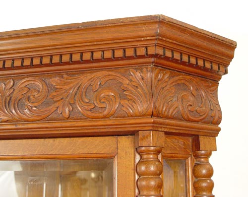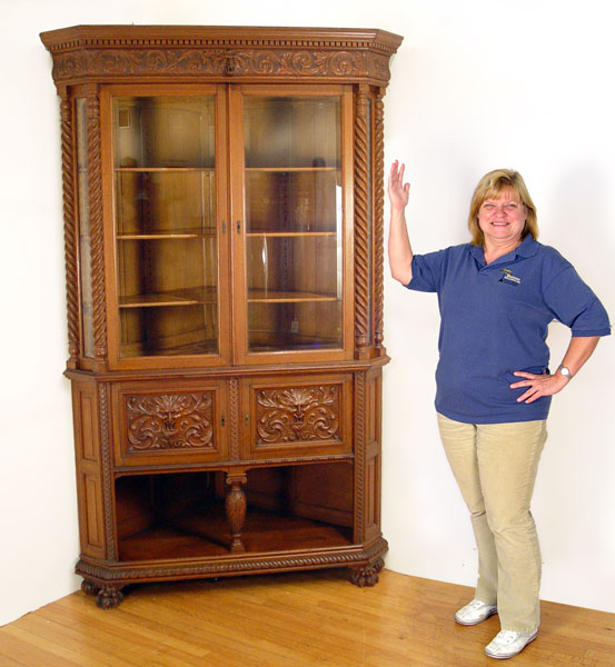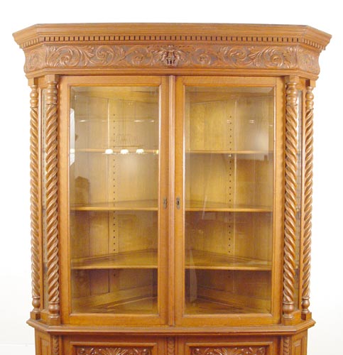 HORNER NORTH WIND CARVED OAK CORNER CABINET: 2 part cabinet with upper section having dentil carved cornice over a carved frieze centering the North Wind. Double columns of spiral stiles. Beveled glass door and canted corner glass panels. Adjustable shelves with plate grooves. Base cabinet with North Wind door panels over open storage. Panel back. Approx. 85'' high x 37'' wide x 47'' across front