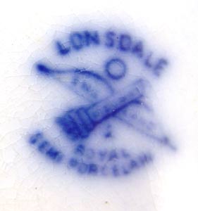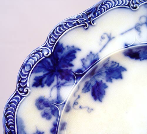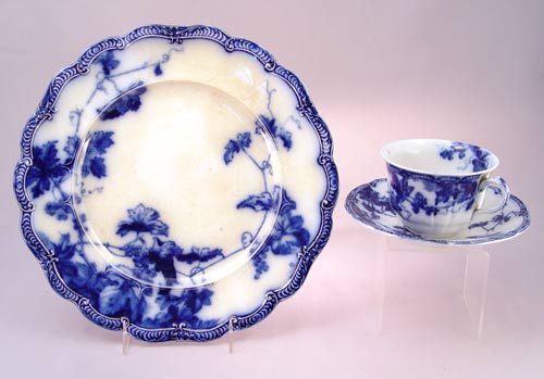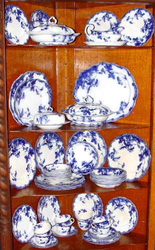 RIDGWAYS LONDSDALE ENGLISH FLOW BLUE CHINA SERVICE FOR 8: 56 pieces. Serving pieces are the 3 platters (11 1/2- 15 1/2''), 2 covered dishes, covered butter with insert, gravy with underplate. 8 each of dinner plates, salad plates, soup bowls, dessert bowls, cups and saucers.