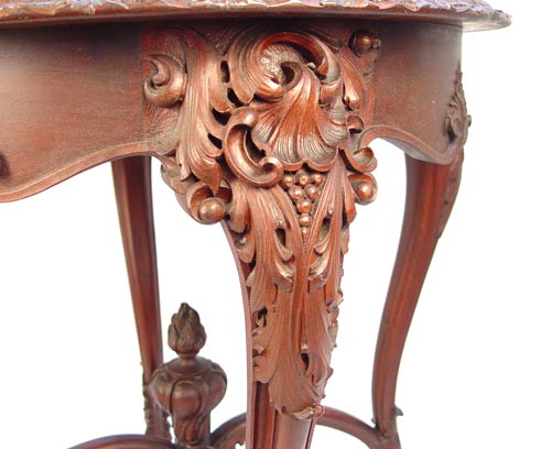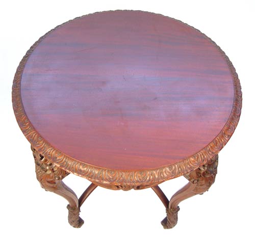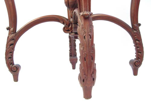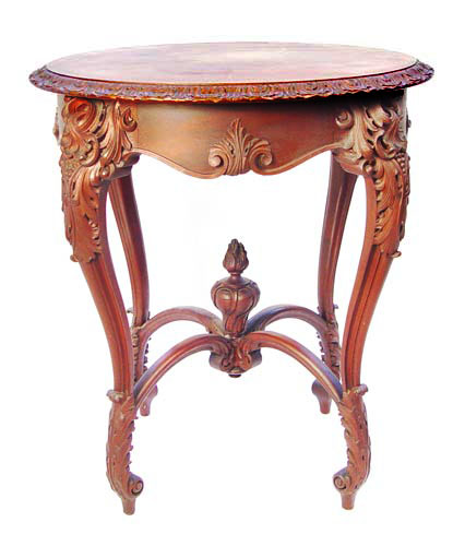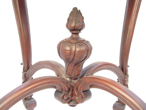 CARVED VICTORIAN PARLOR TABLE: Round top over curved legs, arched stretchers joined by upright finial. Measures 30 1/4'' high x 29'' top dia.