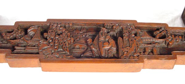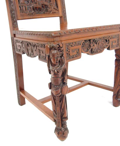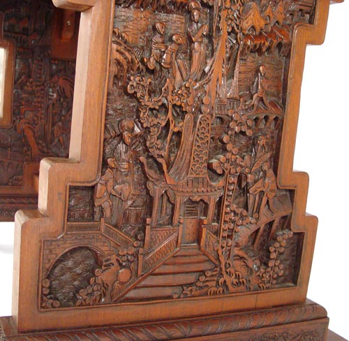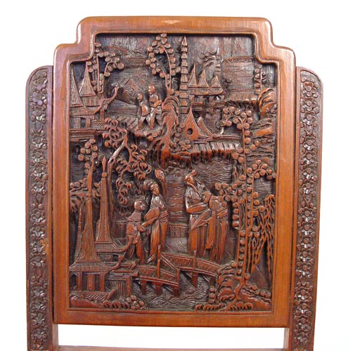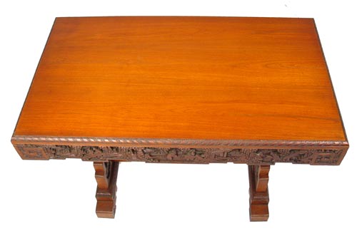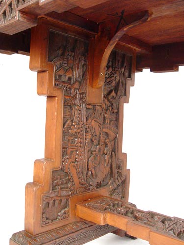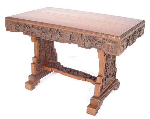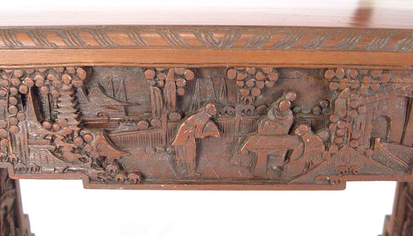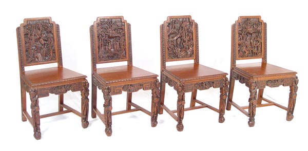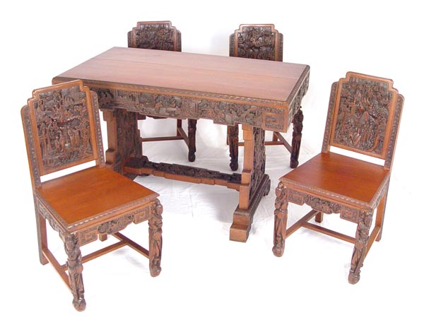 CHINESE CARVED TABLE AND 4 SIDE CHAIRS: Intricate carvings to the table apron, legs and the chair backs, skirt and legs. The table is approx. 32 1/4'' high x 48'' wide x 27 1/2''. Chairs 34 3/4'' high x 19'' wide x 17 1/2'' deep. Please note beginnings of split in table top.