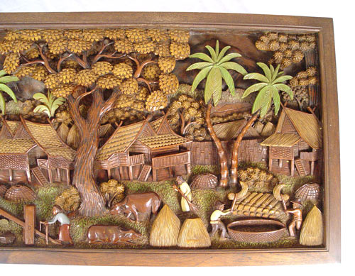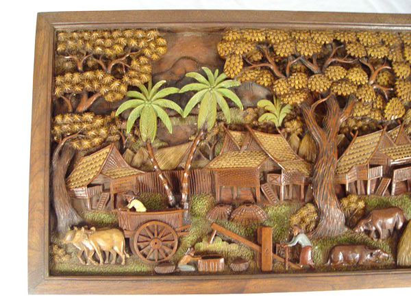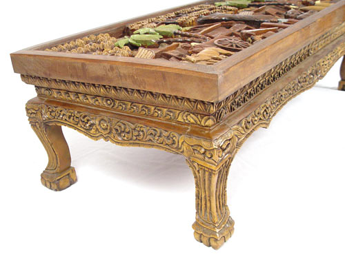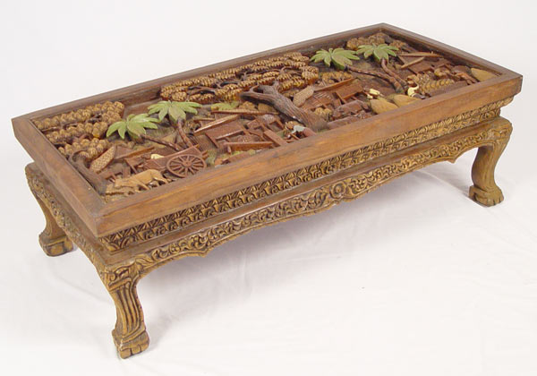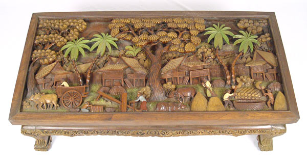 ASIAN CARVED COCKTAIL OR TEA TABLE: Deeply carved country village scene, carved apron and legs. 16 1/2'' high x 50'' wide x 24 1/2'' deep.