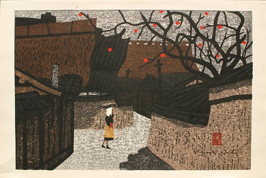 SAITO, Kyoshi (Japanese 1907-1992): Village Landscape with Figure, full size 11 1/2'' x 17 1/4'', framed, 14'' x 20''. Small abrasion in upper left quadrant.