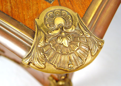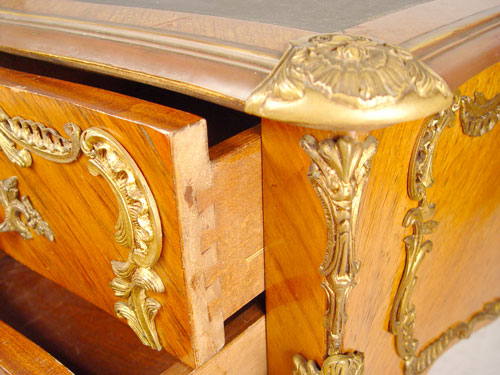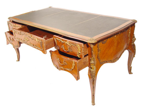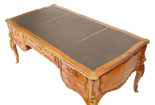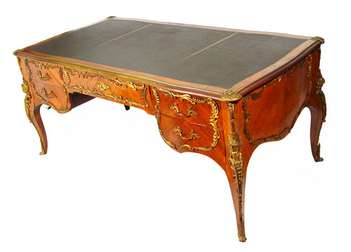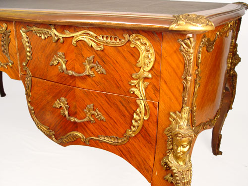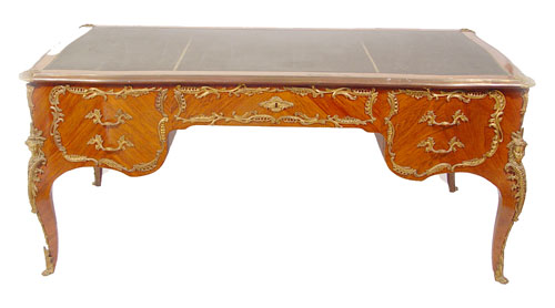 LOUIS XV STYLE FRENCH BUREAU PLAT DESK: Ormolu decorated 5 drawer desk with matchbook veneers and masquerons on the legs. 31'' high x 70'' wide x 35 3/4'' deep