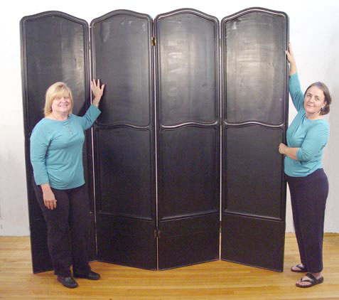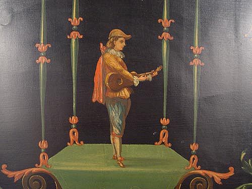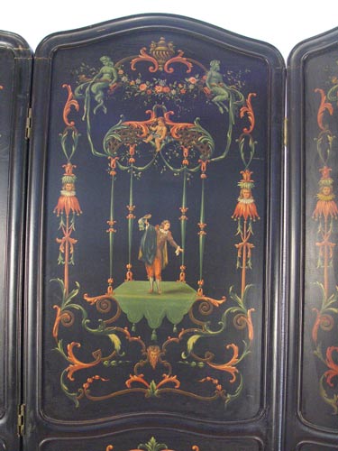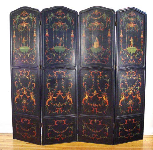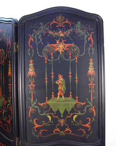 HAND PAINT DECORATED 4 PANEL SCREEN: Each panel is hand painted in its own individual baroque musical figures and cherubs. Arched top, molded edges. 7'4'' high. Each panel is 23.5'' wide, each approx 1 1/2 thick. Wgt 112.5 lbs.