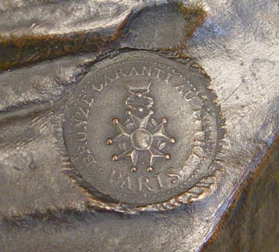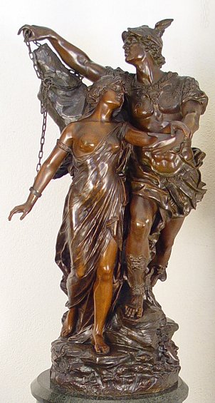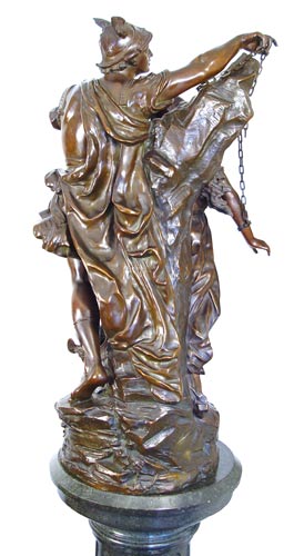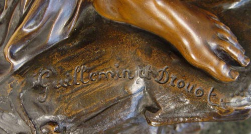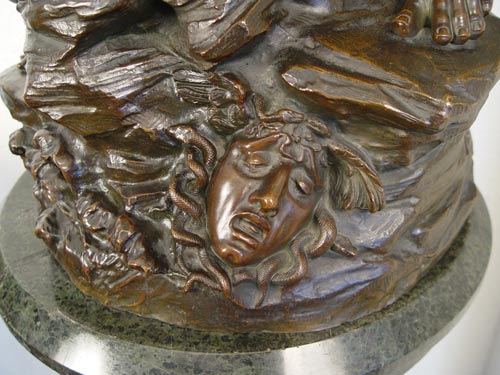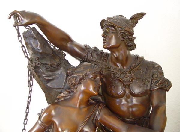 IMPORTANT 19TH C. PERSEUS & ANDROMEDA BRONZE: Signed by both Guillemin and Drouot, 38''h., depicts the rescue with Perseus stepping on Medusa's head, with articulated chains, Paris foundry mark, Bronze Garanti Au Titre.
