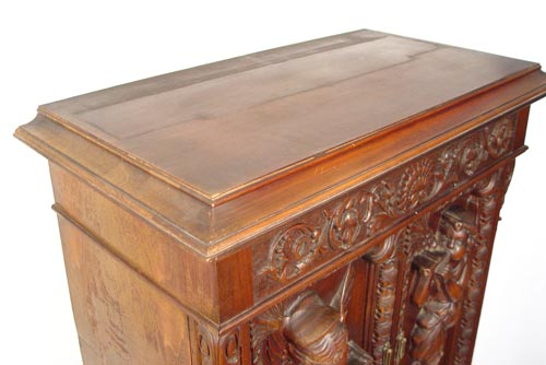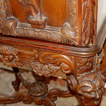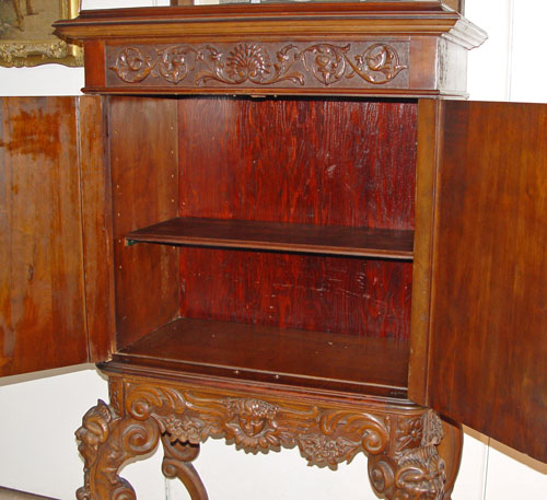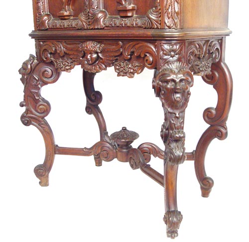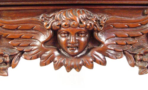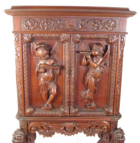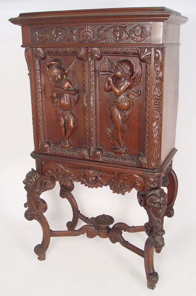 ITALIAN BAROQUE CARVED CABINET: Richly carved cabinet featuring deep carved full body cherubs on the door panels, winged angel centered on the skirt and masqueron carved cabriole legs joined by carved stretchers. 61'' high x 34'' wide x 17 3/4'' deep.