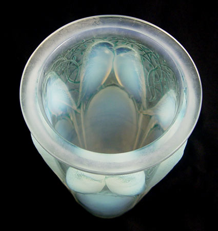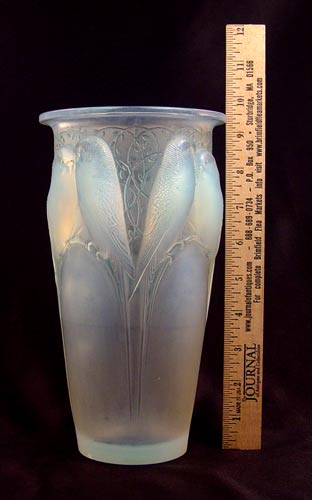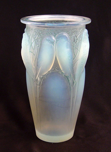 R. LALIQUE CEYLAN OPALESCENT VASE: 9 1/2'' high. Signed ''R. LALIQUE FRANCE'' in block letters, ''No. 905''. Frosted and opalescent glass with budgerigars and vines and leaved motif. Note scratches to base, small internal glass flaw at base.