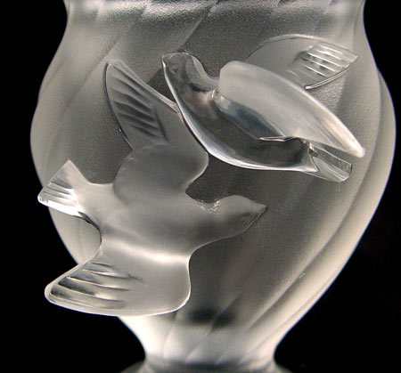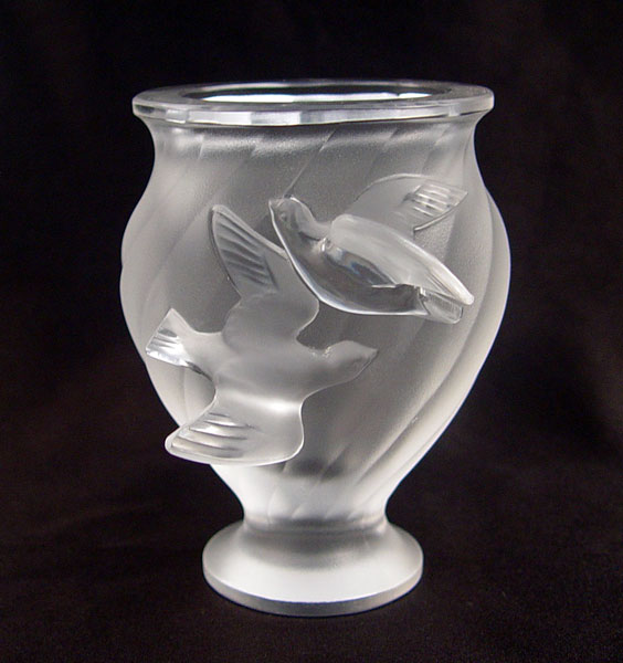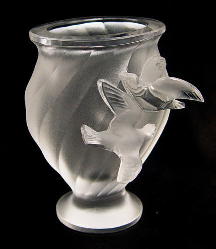 LALIQUE FROSTED GLASS VASE WITH DOVES: Frosted crystal with twist design and doves on front. Signed Lalique France on base. Measures 5'' high.