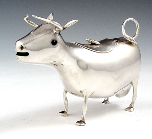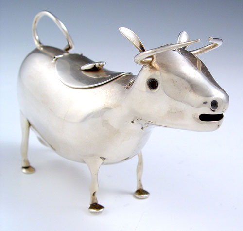 H. HOOIJKAAS DUTCH STERLING FIGURAL COW PITCHER: 1948 Dutch export marks, made by H. Hooijkaas, Schoonhoven. Bee on hinged cover. Dark red glass eyes. Measures 3 3/4'' high x 5 3/8'' long. Approx 4.6 troy oz.