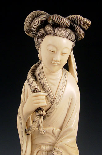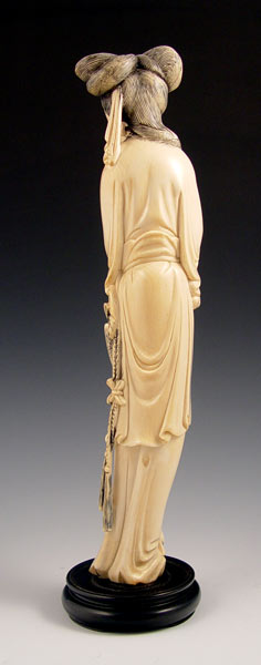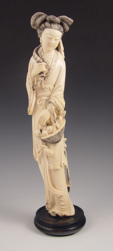 CHINESE CARVED IVORY WOMAN WITH BASKET: Carved from one piece. Measures 14'' high. On wood stand, 15 1/4'' high overall.