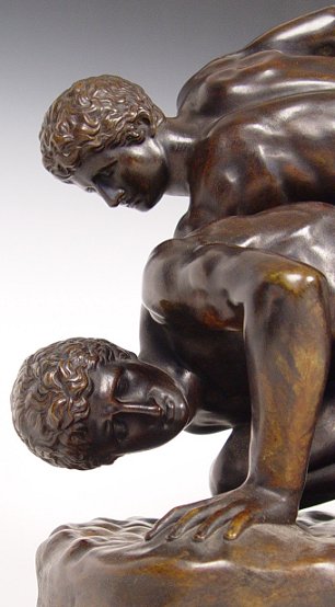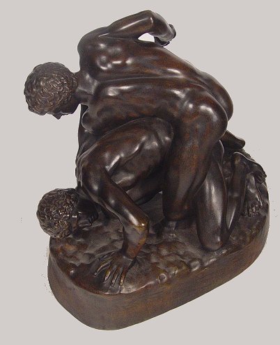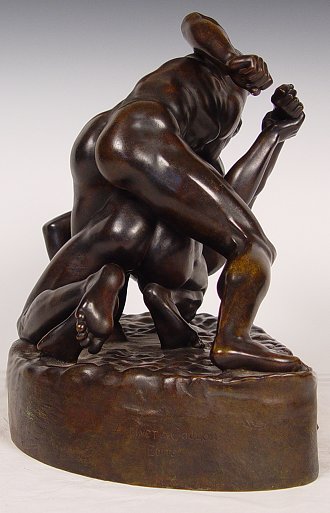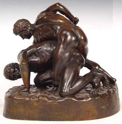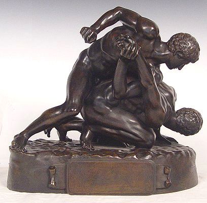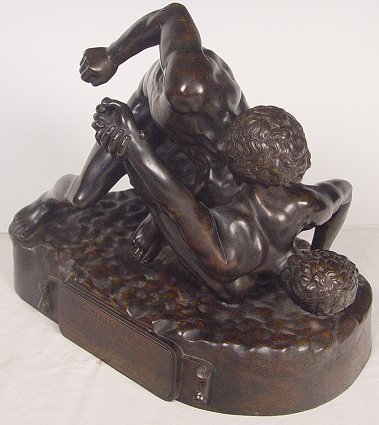 EXCEPTIONAL 19TH C. WRESTLERS BRONZE AFTER THE ANTIQUE: Incised dedication to Mr Jules Merlet, Chevalier de la Legion d'Honneur, Souvenir de ses Collaborateurs, dated 17 Juin, 1876, signed by MONTAUBIN, Secretaire General; BLANC, Secretaire Prefet de Saumur; B de la CHAPELLE, Secretaire Prefet de Cholet; de S. de BOISSEAU, Secretaire Prefet de Segre; the opposite side is incised CORMERIAS, MOREAU, RETAILLIAU, LEDDET: Conseillers de Prefecture, also incised Albinet et Coulon edits, 17'' high x 17 3/4'' x 11 1/2''. Superior 19th Century casting of a classic! Est. $2000/4000**