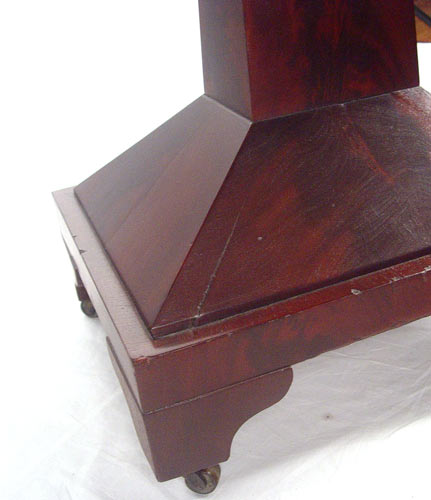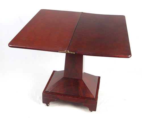 AMERICAN EMPIRE GAME TABLE: Flamed grain mahogany flip top game table, applied scallop decoration, please note bowed top panel, 30 1/2''h., 35'' x 17'' closed and 35'' x 34 1/2'' open, brass castors.