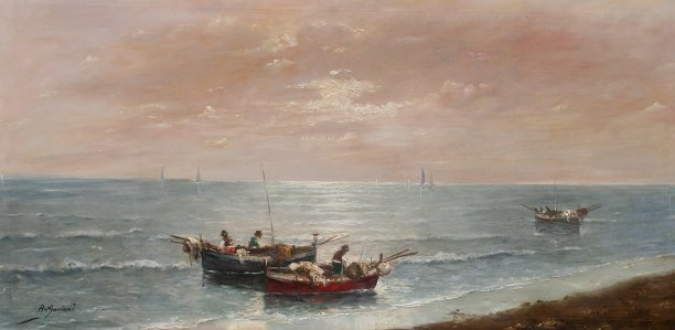 MARIANNI, A., (Italian, 20th C.): Italian Coastal Scene, OIL/C, 24'' x48'', signed and framed, 29'' x 53''. Several small patches verso. Est. $300/500**