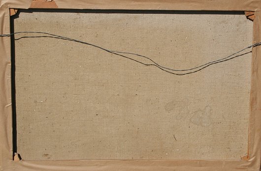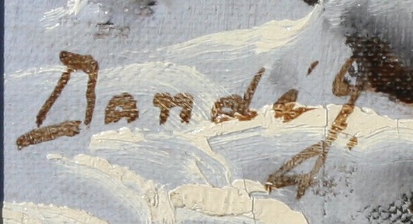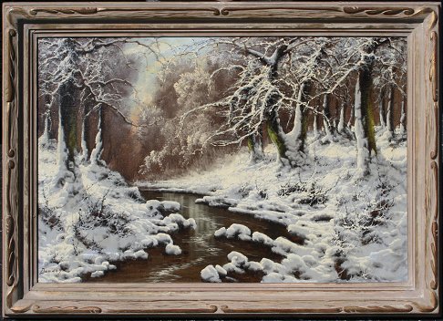 SNOWY WINTER STREAM PAINTING LIKE NEOGRADY: Signed Dandey?, Oil/C, 24''x 36'', encased in carved and painted frame, 30'' x 42''. Est. $400/600**