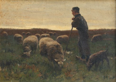 STEELINK, Willem, (Dutch, 1826-1913): Sheep with Shepherd, OIL/C, 11'' x 15 1/4'', signed, framed. Needs cleaning. Est. $800/1200**