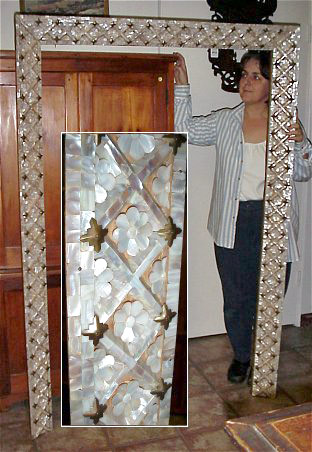MOTHER OF PEARL CLAD FRAME / SURROUND: Tiles of mother of pearl in geometric and flower design. Top and 2 sides. 67 1/2'' x 45 1/2'', interior 63'' x 37 3/4''.
