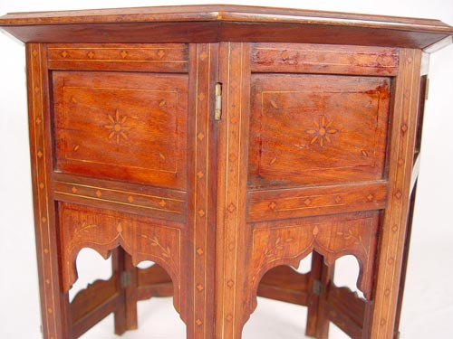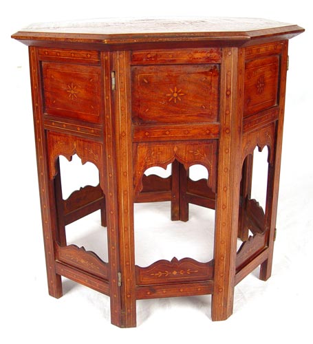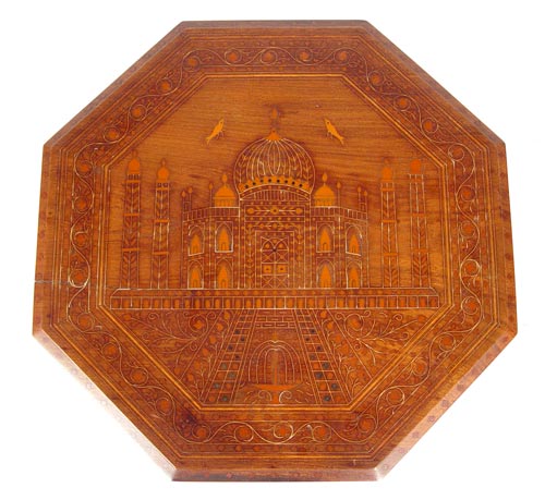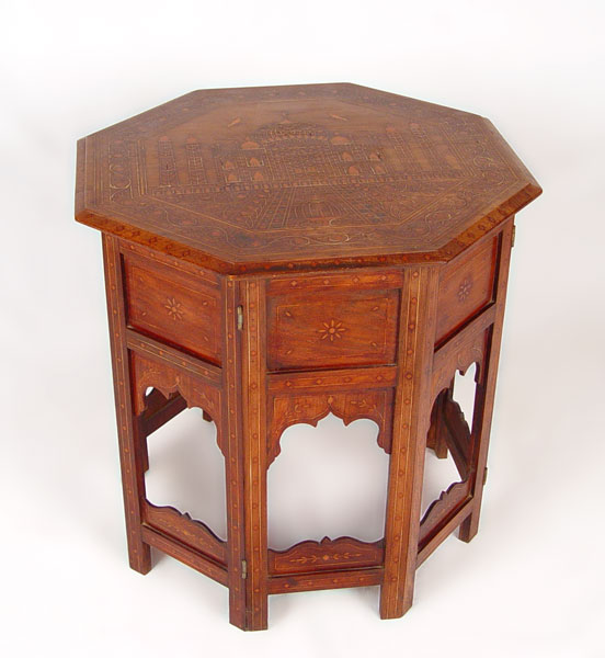 INLAID OCTAGON TAJ MAHAL TAMBOUR TABLE: Profusely wood inlaid decoration of Taj Mahal on top. 8 sided with hinges on corners. Measures 20 1/4'' high x 21 1/2'' dia. Note paint spatter, split in top, 2 pieces of inlay loss.