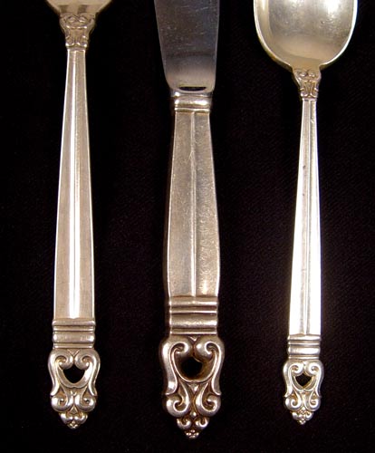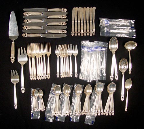INTERNATIONAL ''ROYAL DANISH'' STERLING FLATWARE SERVICE: 81 pieces in the Royal Danish pattern by International to include 8 dinner forks, 7 1/8'', 8 salad forks, 6 3/8'', 16 teaspoons (3 in original plastic) 6'', 8 soup spoons (2 in original plastic) 6 1/2'', 8 dinner knives, 9'', 8 butter knives, 6'', 8 cocktail forks in original plastic, 5 1/2'', olive / pickle fork in original plastic 5 3/4'', 8 demitasse spoons (1 in original plastic) 4 1/4'', 2 serving spoons 8 1/2'', pierced tablespoon 8 1/2'', gravy ladle 6 1/2'', cold meat serving fork 8 7/8'', small cold meat serving fork 7 5/8'', jelly server 6 1/2'', cake server 10 1/8''. Approx. 101.5 troy oz. Comes in wood silver storage chest, measures 3 3/4'' high x 20'' x 12'', note condition of chest. Est. $1800/2200**
