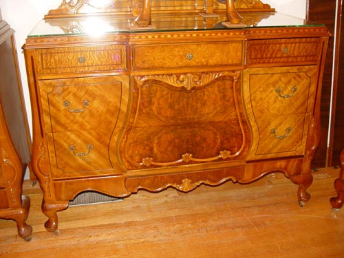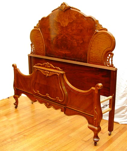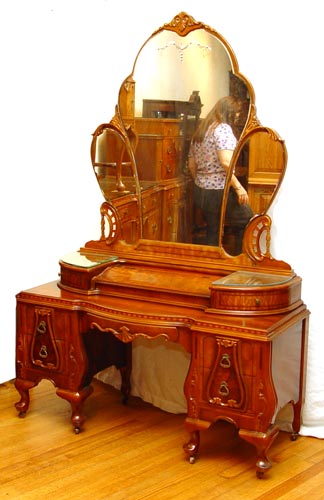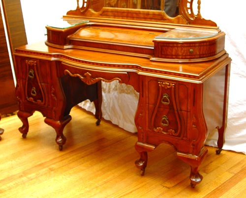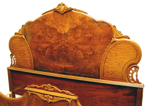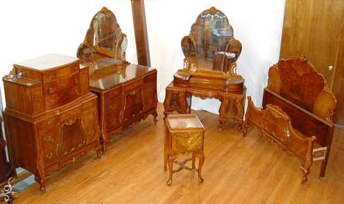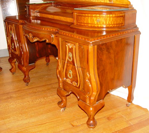 HIGH STYLE 5 PIECE ART DECO BEDROOM SET: Plenty of detail with the burl and richly grained walnut veneers, repeating diamond inlay on the chests and etched mirrors. The set includes a full size BED (5 1/2'' tall) , CHEST ON CHEST having 9 drawers and 2 compartments (55''h. x 40'' x 22''), DRESSER with shaped three part mirror (70''h. x 50'' x21''), VANITY with MIRROR (70'' x 48'' x 18''), and a single drawer NIGHTSTAND, 29''h.