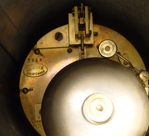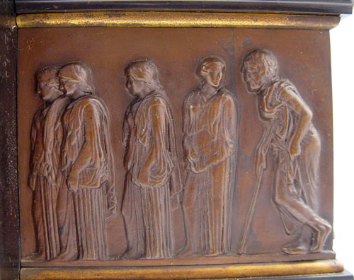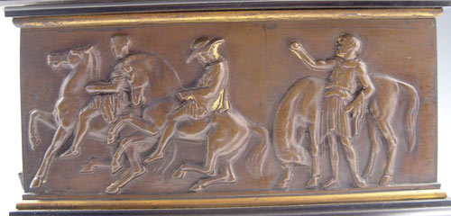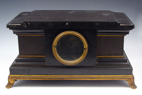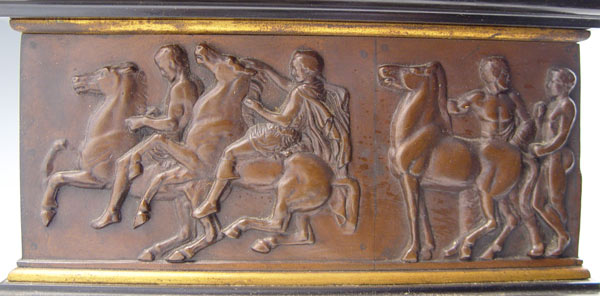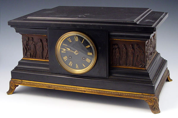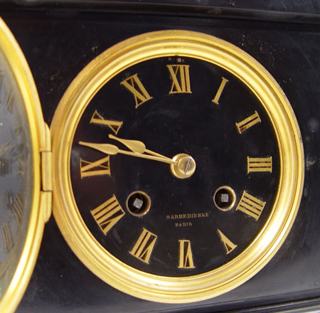 C.H. BOYE BARBEDIENNE MARBLE MANTLE CLOCK: Circa mid 19th century marked Barbedienne Paris on face. Bronze relief panels on either side depicting Roman figures. 4 feet. Key and pendulum works are marked C. H. Boye. Missing bronze figure on top, most likely Cleopatra. Measures 8 1/2'' high x 15 1/2'' wide x 8 1/2'' deep.