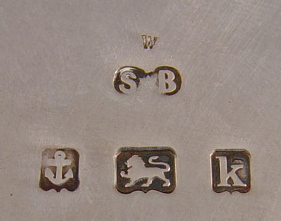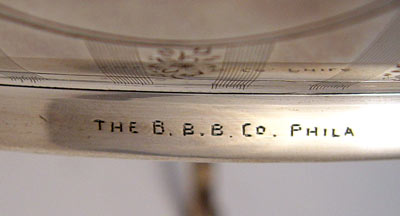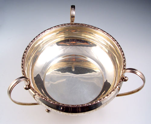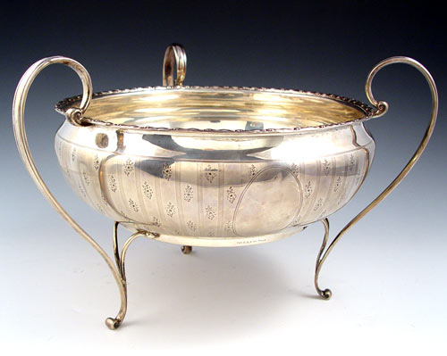 1909 ENGLISH SNYDER & BEDDOES STERLING HANDLED CENTER BOWL: 1909 Snyder & Beddoes Birmingham hallmarks. Also marked ''The B.B.B. Co. Phila'' for Bailey, Banks & Biddle on bottom edge. Three handles swoop to form 3 reinforced feet. Garland rim design, engraved vertical lines and floral decoration outside bowl. Approx 37 troy oz. Measures 9'' high x 13 1/4'' wide.