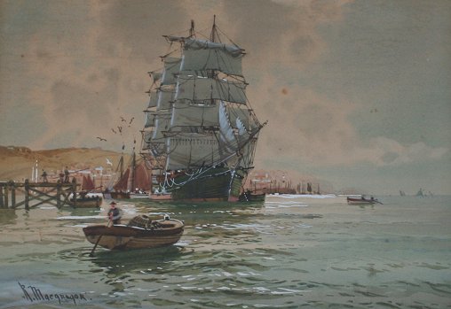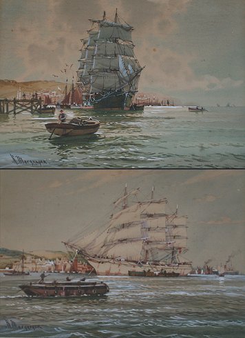 MacGREGOR, Robert, (British, 20th C): 2 Ship Paintings, W/C's, sight size 10'' x 14'', signed and framed, 18'' x 23''. Scattered foxing, not examined out of frame. Est. $300/500**
